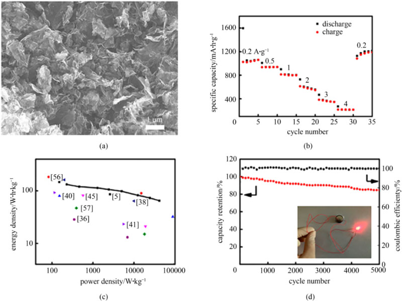 圖10 (a) CoO-RGO的掃描電鏡照片;(b) CoO-RGO的倍率性能;(c) CoO-RGO//HCN鋰離子電容器的Ragone曲線;(d) CoO-RGO//HCN鋰離子電容器的庫侖效率和循環(huán)壽命