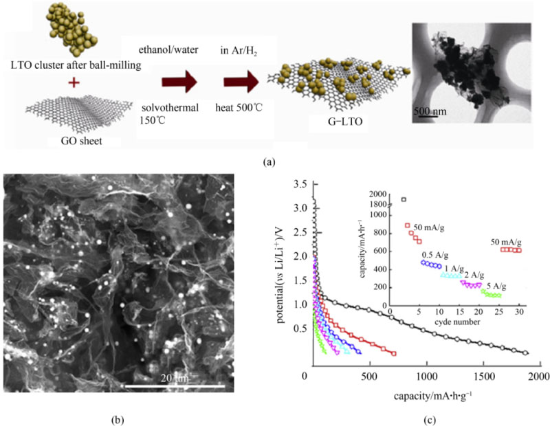 圖9 (a) G-LTO納米復合材料的合成原理圖及掃描電鏡照片;(b) SnO2-RGO的掃描電鏡照片;(c) SnO2-RGO的倍率性能