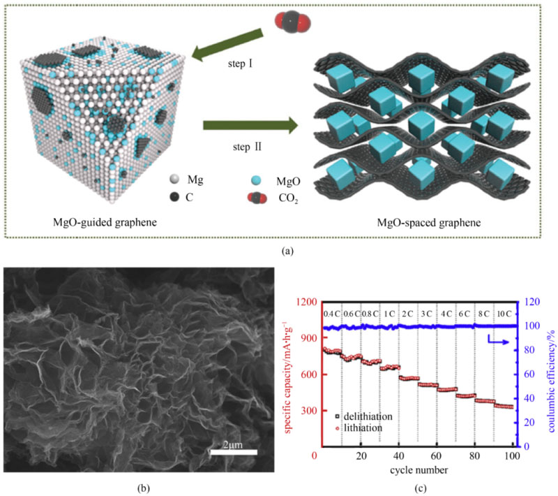 圖7 (a) 自蔓延高溫合成石墨烯的制備原理示意圖;(b) SHSG的掃描電鏡照片;(c) SHSG負極的倍率性能