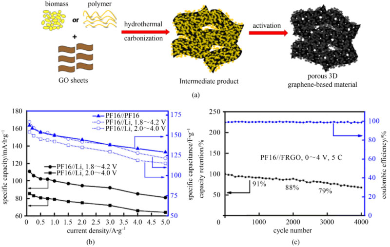 圖5 (a) 多孔三維石墨烯材料(PF16)的制備流程圖;(b) PF16正極材料的電化學性能;(c) 基于PF16正極的鋰離子電容器的循環(huán)壽命和庫侖效率