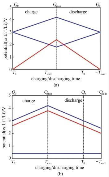 圖2 (a) 基于活性炭的雙電層超級電容器的充放電工作電壓曲線;(b) 鋰離子電容器的電壓充放電工作電壓曲線,其負極為石墨,正極為活性炭