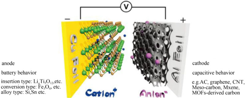 近年來已陸續(xù)報道了許多使用不同正負極材料的鋰離子電容器。然而由于Li+在負極中緩慢的嵌入/脫出反應很難與正極中電解質陰離子的快速吸脫附過程相匹配,而大大影響了鋰離子電容器的電化學性能。因此,開發(fā)擁有高導電性和高比容量的正負極材料對提高鋰離子電容器的電化學性能具有十分重要的意義。