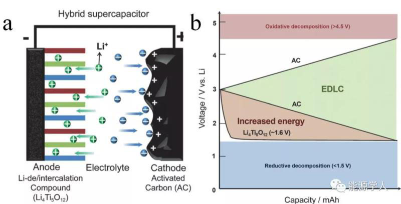 圖8. (a) 混合超級電容器電化學(xué)反應(yīng)機理。(b) 雙電層電容器和混合超級電容器中負(fù)極和正極典型的電化學(xué)曲線。相對于鋰金屬,電解液的氧化和還原分解分別發(fā)生在高于4.5 V和低于1.5 V的電壓下。