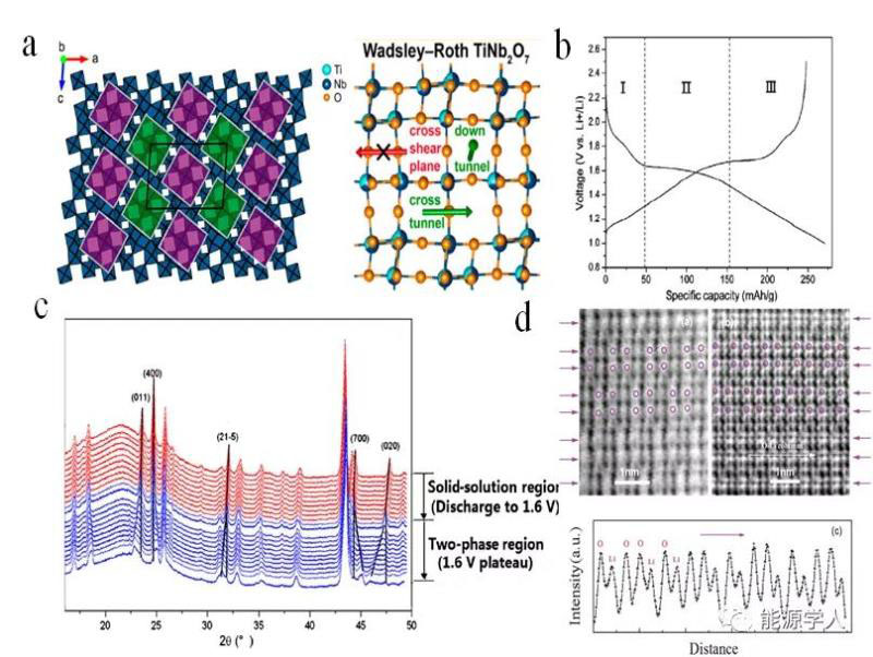 Goodenough于2011年率先研究了TiNb2O7作為鋰離子電池Ti-Nb-O(TNO)負(fù)極材料,理論容量是Li4Ti5O12的兩倍,為387.6 mAh g-1。TNO化合物屬于單斜切ReO3型晶體結(jié)構(gòu),其分層結(jié)構(gòu)沿[010]晶帶軸分布,如圖2a所示。如圖2d所示,Chen等使用環(huán)形明亮場(ABF)掃描透射電子顯微鏡(STEM)研究了TiNb2O7中鋰離子的嵌入和脫嵌機理。鋰離子沿著[010]晶帶軸的1D通道被存儲在(001)平面上。當(dāng)四個Li+嵌入TiNb2O7中形成Li4TiNb2O7時,晶胞體積將擴大9.2%。ReO3的剪切結(jié)構(gòu)在鋰離子的嵌入/脫出過程中可以基本保持不變,因此具有出色的結(jié)構(gòu)穩(wěn)定性。