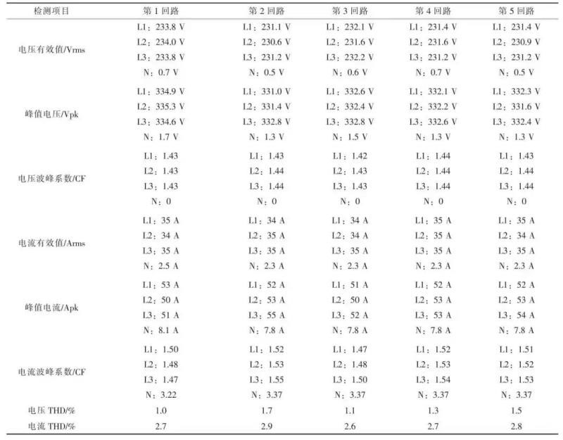 電能質(zhì)量是評價某個電網(wǎng)或某個供電點電能質(zhì)量優(yōu)劣的主要方法[12]。儲能電站運行期間,利用電能質(zhì)量分析儀對儲能變流器交流側(cè)充放電時的電能質(zhì)量進行檢測,檢測項為電流電壓的有效值、電流電壓峰值、諧波、不平衡等。經(jīng)實測,各回路充放電時的電能質(zhì)量均在國家標準規(guī)定范圍內(nèi),儲能電站各回路25 kW 放電電能質(zhì)量測試數(shù)據(jù)(部分)見表5。