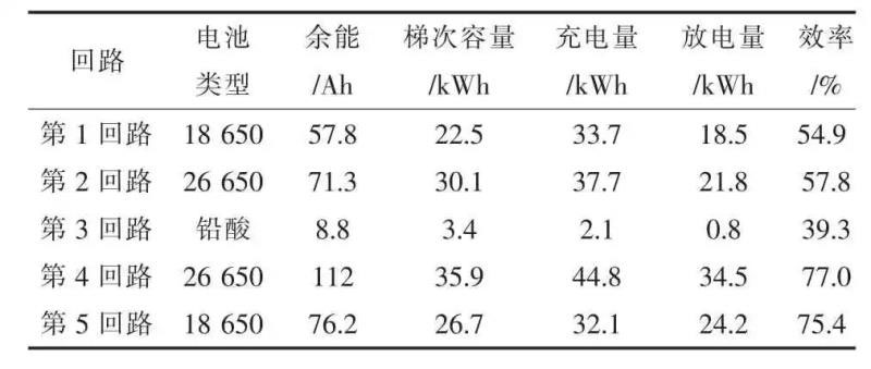 GB/T 36549—2018《電化學(xué)儲能電站運行指標及評價》規(guī)定,儲能單元充放電能量效率是衡量儲能電站能效指標之一,依據(jù)表4 數(shù)據(jù),磷酸鐵鋰的數(shù)據(jù)優(yōu)于三元鋰,鉛酸電池效果最差,第1和2 回路充放電效率在55%左右,其電芯生產(chǎn)日期為2010 年,早期動力電池梯次利用價值不大,近幾年來我國動力電池技術(shù)進步迅速,無論是性能還是能量密度都有了很大提升,也有效延長了電池使用壽命。但目前已經(jīng)退役的動力電池多為早期投入市場,這批電池使用能量密度低、性能穩(wěn)定性差,進行梯次利用價值并不大,因此其充放電效率也在合理范圍之內(nèi);第4 和5 回路充放電效率值比較為理想,主要由于現(xiàn)階段制造動力電池工藝水平的進步,電池能量密度、性能穩(wěn)定性都有所提升。