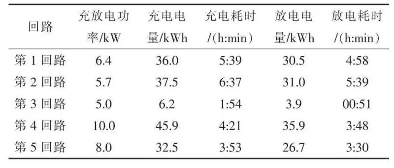儲能電站運行效果評價包括充放電能力、能效水平和設(shè)備運行狀態(tài)3 個方面[13],其中,充放電能力評價包括儲能電站實際可充放電功率、實際可放電量以及儲能單元能量保持率指標。經(jīng)過對電站各回路的充放電能力、運行效果、切換時間和電能質(zhì)量的數(shù)據(jù)分析,得出以不同類型、結(jié)構(gòu)、時期的退役動力電池為儲能載體的異構(gòu)兼容電站符合儲能電站的技術(shù)要求。