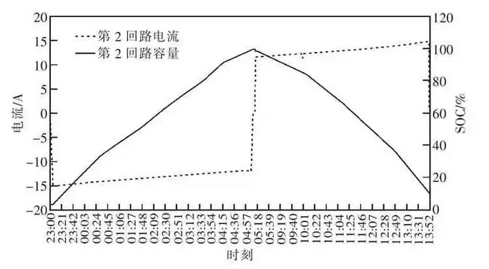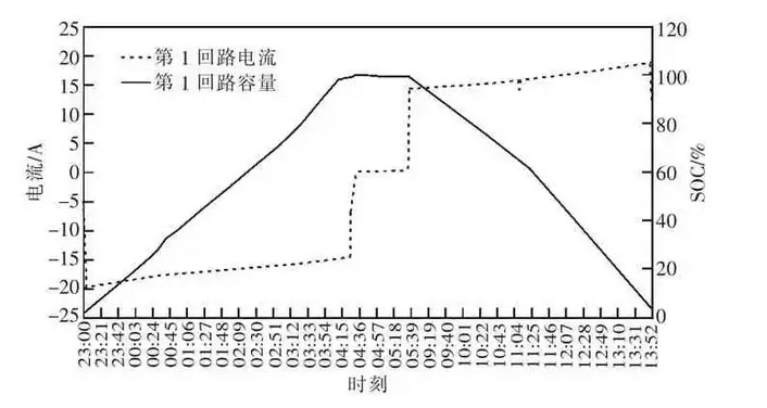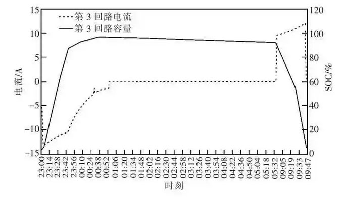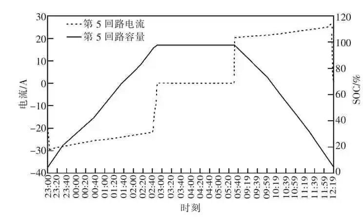 電站各回路按照恒功率的控制方式,各回路充放電的功率分別是6.4 kW,5.7 kW,5 kW,10 kW 和8 kW。在充放電過程中,各回路配置BMS 進行保護,為了安全起見,電芯間壓差過大或過溫等情況下,BMS 將進行保護,因此,各回路電池容量并沒有完全充滿或放空。各回路充放電設(shè)定的功率是恒定的,電壓則不斷變化,根據(jù)公式I=P/U,PCS 不斷地調(diào)節(jié)電流以達到恒功率充放電的目的。依照圖9—13 可知,在初始和結(jié)束階段會以一個較小的電流進行充放,起到激活和保護電池的作用;整個充放電過程中,各回路的退役電池不會出現(xiàn)“一充就飽,一放就了”的情況,放電功率不會隨電池的容量降低而下降。