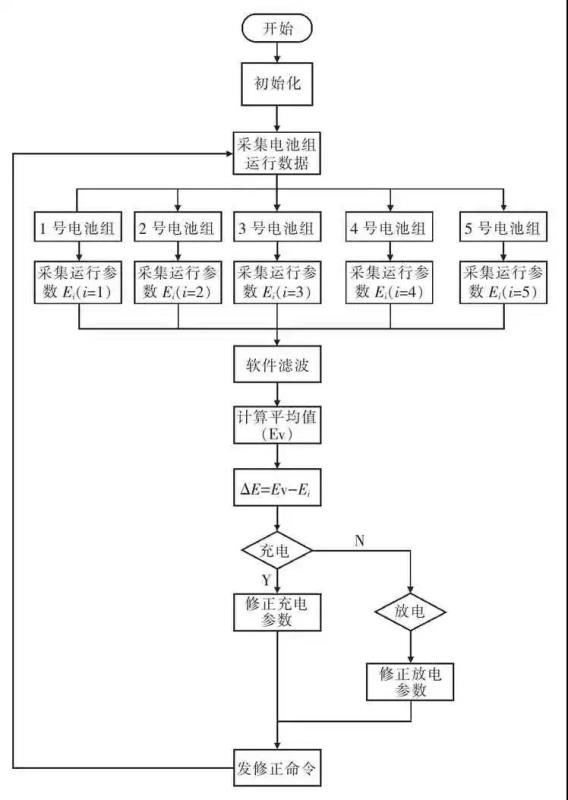 系統(tǒng)實時采集當前每組(i)的工作參數(shù)E(電流I、電壓V、功率P),再進行均衡計算,計算出各組當前的平均值Ev,根據(jù)各組與平均值Ev的差值(ΔEi)再返調(diào)節(jié)各組,大于Ev 的減少其給定值,小于Ev 的增加其給定值,使所有組逐次逼近Ev,從而使整個儲能系統(tǒng)充放電均衡,使其發(fā)揮最佳性能。