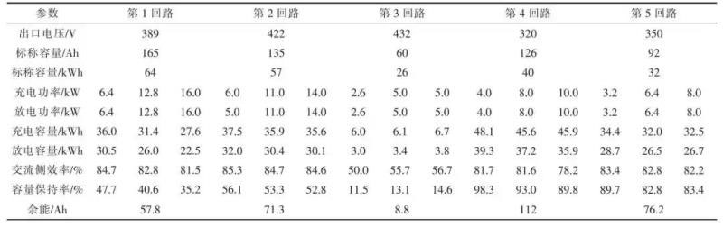 電站5 個回路按照0.25 倍標稱容量進行恒功率充放電檢測余能容量,數(shù)據(jù)見表2,為了體現(xiàn)不同倍率下充放電的余能,又以標稱容量的0.1 和0.2 倍率進行DOD(放電深度)測試。
