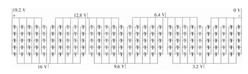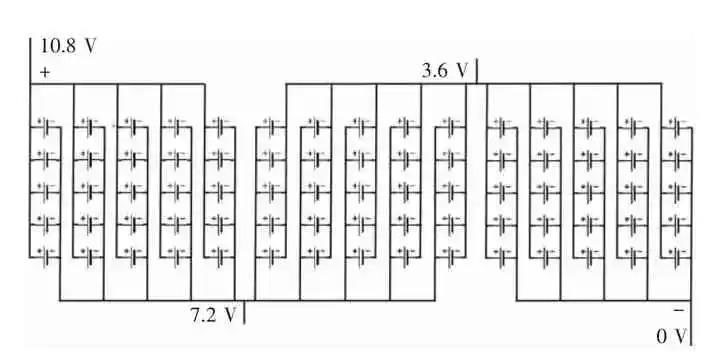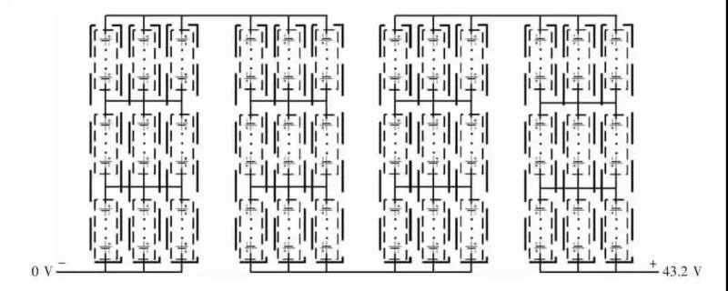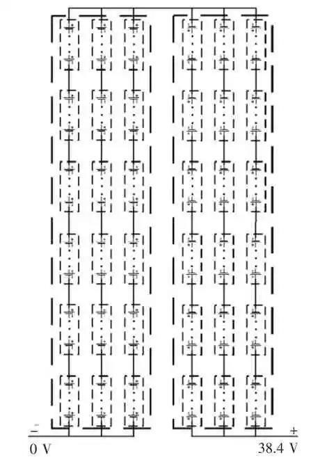(1)第1 回路:選擇2015 年退役電動汽車的電池包,將其拆解至電芯,篩選重組成模組,電芯類型是18650,標稱電壓為3.6 V,標稱容量為2.2 Ah;模組結(jié)構(gòu)25P3S,電池箱內(nèi)裝12個模組,電池組由9 個電池箱(共8 100 只電芯)串接構(gòu)成,模組及電池箱電氣連接如圖3 和4 所示。