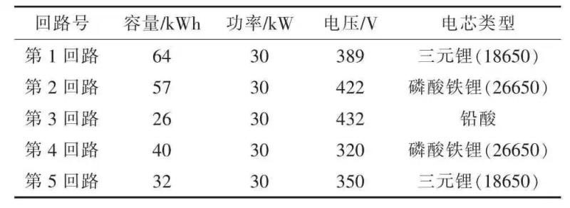 儲能電站由退役動力電池、儲能PCS(變流器)、BMS(電池管理系統(tǒng))、EMS(能源管理系統(tǒng))等組成,為了體現(xiàn)儲能電站的異構(gòu)兼容特征,電站選用5 種不同類型、結(jié)構(gòu)、時期的退役動力電池進行儲能(為突出“異構(gòu)”特色,系統(tǒng)還選用一路退役的鉛酸蓄電池)。