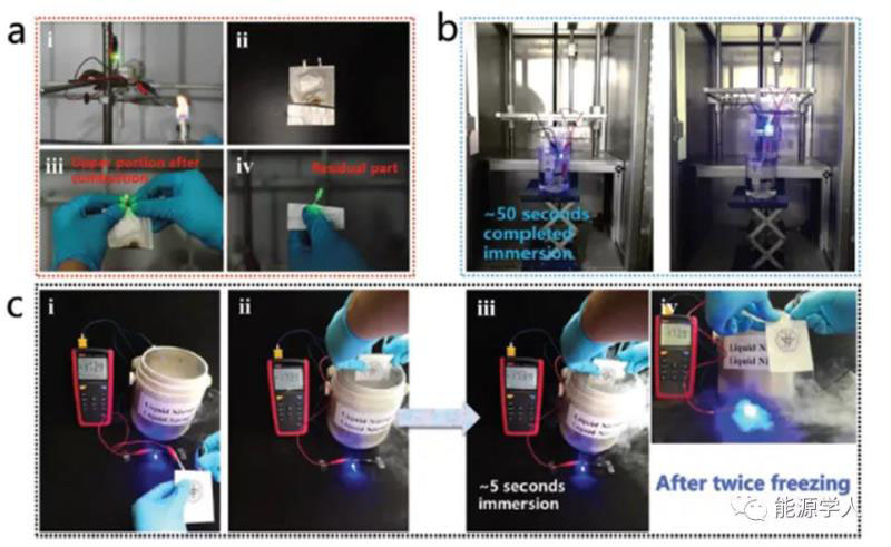 雙層異質(zhì)復合固態(tài)電解質(zhì)的使用極大地改善了電池的使用安全性,在經(jīng)歷如釘穿、對折以及剪切等濫用性實驗后電池未發(fā)生過熱、燃燒等情況且仍能為用電器件進行供能(圖5d,e)。得益于聚合物基質(zhì)的不燃性、凝膠中的阻燃添加劑以及無機材料優(yōu)良的熱穩(wěn)定性,使用雙層異質(zhì)復合固態(tài)電解質(zhì)所組裝的軟包電池展現(xiàn)出良好的高溫安全性、水下短路穩(wěn)定性以及極端低溫(液氮)環(huán)境中的耐受性(圖6)。