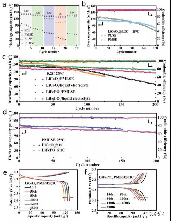 圖4. LiCoO2(LiFeO4)/PMLSE/Li電池的倍率性能和循環(huán)穩(wěn)定性