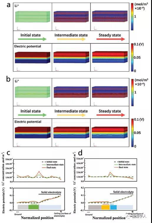 為了進一步探究PLSE的失效機制(相較于PMLSE),基于有限元分析,我們利用COMSOL對使用兩種電解質(zhì)電池中的多物理場進行了模擬(圖3)。當PLSE作為固態(tài)電解質(zhì)時,聚合物成分仍舊是離子傳導的主體,盡管固態(tài)電解質(zhì)有很高的體離子電導率,但在界面處的固-固傳質(zhì)過程仍存在巨大的勢壘,這會導致界面處極易出現(xiàn)離子濃差極化以及離子的不均勻沉積,由此所引發(fā)的過高的極化電壓會導致電池內(nèi)部電勢失衡,最終使得電池失效。在引入含有MOF的高離子導復合凝膠層后,界面離子傳輸勢壘減小,同時MOF的孔道會調(diào)控離子束流高效的均勻沉積,實現(xiàn)電勢的均勻分布,而均勻分布的電勢又會進一步誘導鋰離子的均勻沉積,最終在界面處和電池內(nèi)部整體實現(xiàn)良性的循環(huán),保證電池的穩(wěn)定循環(huán)。