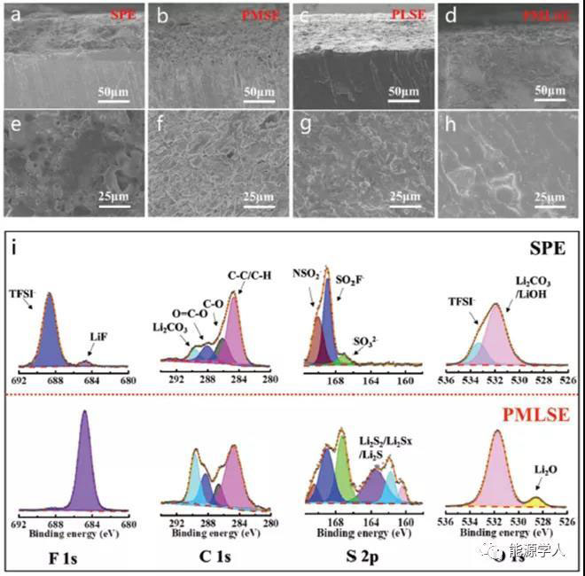 通過對比使用不同種類固態(tài)電解質(zhì)所組裝的Li/Li對稱電池的循環(huán)性能,功能性無機填料的加入可以明顯地提升聚合物固態(tài)電解質(zhì)的電化學穩(wěn)定性。但對于長期的循環(huán)穩(wěn)定性而言,由于PMSE機械性能的不足導致了Li/Li對稱電池最終還是出現(xiàn)了短路的現(xiàn)象,使用力學性能更為優(yōu)異的PLSE所組裝的電池同樣也出現(xiàn)了過度極化的失效機制,這意味著復合凝膠層在改善PLSE的界面電化學穩(wěn)定性方面有著明顯的作用。拆解觀察循環(huán)后鋰金屬的形貌可以看出使用PMLSE雙層電解質(zhì)的對稱電池中的鋰金屬負極表面更為致密平整(圖2)。通過XPS分析可以得知,PMLSE電解質(zhì)相較于SPE而言,更加有利于促進以LiF和有機-無機硫化物為主導成分的SEI層的形成。