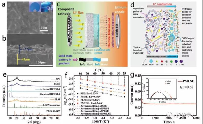 為了提高聚合物電解質(zhì)的離子傳導特性和整體的電化學穩(wěn)定性,首先通過靜電紡絲技術(shù)和合理的煅燒制度制備了具有高長徑比的一維石榴石(Li6.75La3Zr1.75Nb0.25O12,LLZN)納米線,并將其作為填料引入至PVDF-HFP/LiTFSI體系中得到力學性能、電化學性能優(yōu)良的復合固態(tài)電解質(zhì)(PLSE);其次對PSLE進行表面改性后作為基體,通過刮涂的方法將含有MOF(微米-納米復合尺度的HKUST-1)的復合凝膠層置于其表面;最后在手套箱內(nèi)烘干即得雙層異質(zhì)結(jié)構(gòu)的復合固態(tài)電解質(zhì)(PMLSE),如圖1a,b所示?;趶秃险龢O材料(PEO/鋰鹽改性的正極)和復合凝膠層,固態(tài)電池內(nèi)部的固-固界面實現(xiàn)了軟接觸。PVDF-HFP/LLZN納米線固態(tài)電解質(zhì)基體可以很好地兼容高壓正極,復合凝膠層中的高濃度鋰鹽和MOF所具有的天然孔道促進了電解質(zhì)-電極界面層(SEI)的快速穩(wěn)定形成,誘導了界面處鋰離子的均勻沉積(圖1c,d)。由于兩種功能無機材料的協(xié)同效應,作為對比,PMLSE相較于PVDF-HFP/LiTFSI(SPE)聚合物電解質(zhì)、PLSE以及PVDF-HFP/MOF(PMSE)兩種復合固態(tài)電解質(zhì)在鋰離子傳輸效率(電導率和鋰離子遷移數(shù))上有了明顯提升(圖1e-g)。