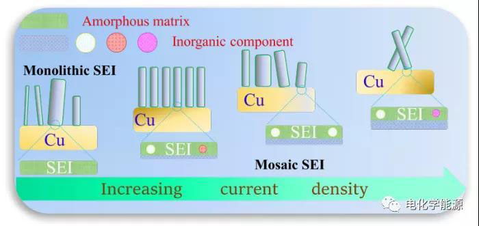 電流密度是控制鋰沉積形貌和固體電解質(zhì)界面(SEI)的關(guān)鍵因素。然而,電流密度對Li沉積和SEI的原子級機制尚不清楚。太平洋西北國家實驗室Wu Xu, and Chongmin Wang等基于低溫透射電子顯微鏡(TEM)成像,結(jié)合能量色散X射線能譜(EDS)和電子能量損失譜(EELS)的電子結(jié)構(gòu)分析,揭示了Li沉積形貌和SEI與電流密度的原子級關(guān)聯(lián)。他們發(fā)現(xiàn),電流密度的增加會導(dǎo)致鋰枝晶形核和生長的過電位增加,導(dǎo)致鋰枝晶從生長限制型向成核限制型轉(zhuǎn)變。與電流密度無關(guān),電化學(xué)沉積的鋰金屬(EDLi)呈現(xiàn)晶須狀形貌。在低電流密度(0.1mA/cm2)下形成的SEI是整體非晶的;而高于2mA/cm2的電流密度則形成鑲嵌結(jié)構(gòu)的SEI,其主要特征是具有Li2O和LiF分散體的非晶基體,并且SEI的厚度隨著電流密度的增加而增加。具體地說,Li2O粒子在空間上位于SEI的上表面,而LiF在空間上靠近Li-SEI界面。這些結(jié)果為通過改變沉積條件來調(diào)節(jié)EDLi和SEI的關(guān)鍵微觀結(jié)構(gòu)和化學(xué)特性提供了可能的方法,從而與電池性能直接相關(guān)。