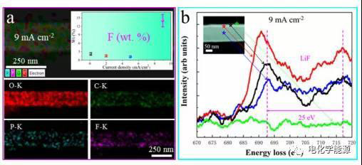 圖. 電解液中鋰金屬枝晶和SEI在電流密度為9ma-cm-2,時間為1.1min時的成分信息。(a)重疊的HAADF-STEM圖像和O-K、C-K、F-K和P-K的EDS圖譜顯示元素分布。插圖:F(wt%)隨電流密度的變化。(b) 66s電流密度為9ma cm-2時,枝晶和SEI的FK邊緣的精細結(jié)構(gòu)比較。