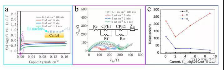 圖.不同電流密度下的電化學(xué)行為:(a) 在不同電流密度下,用Cu-TEM柵極上沉積鋰的實驗電壓分布。觀察到一個明顯的過電位,被粉紅色的橢圓圈起來。插圖顯示了鋰成核的原理,解釋了所涉及的額外能量。(b) 不同電解液中不同電流密度下鋰金屬鍍層阻抗譜變化的奈奎斯特圖比較。插圖是等效電路。Re為體電解液電阻,Rf為鈍化膜電阻,Rct為電荷轉(zhuǎn)移電阻,CPE為恒相元件,Zw為Warbug阻抗。(c) 體電解液電阻(Re)、鈍化膜電阻(Rf)和電荷轉(zhuǎn)移電阻(Rct)隨電流密度的變化而變化。