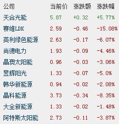 中國儲能網(wǎng)訊:5月25日早間消息,受5月中國PMI值大幅回落影響,周四i美股中概太陽能指數(shù)(SLR10)下跌2.44%,成分股多數(shù)下跌,賽維LDK跌幅領(lǐng)先,跌幅15.08%;晶科能源跌8.35%;英利綠色能源跌6.07%;昱輝陽光跌5.0%;尚德電力、阿特斯太陽能、晶澳太陽能跌幅超3%;天合光能逆市漲5.77%。