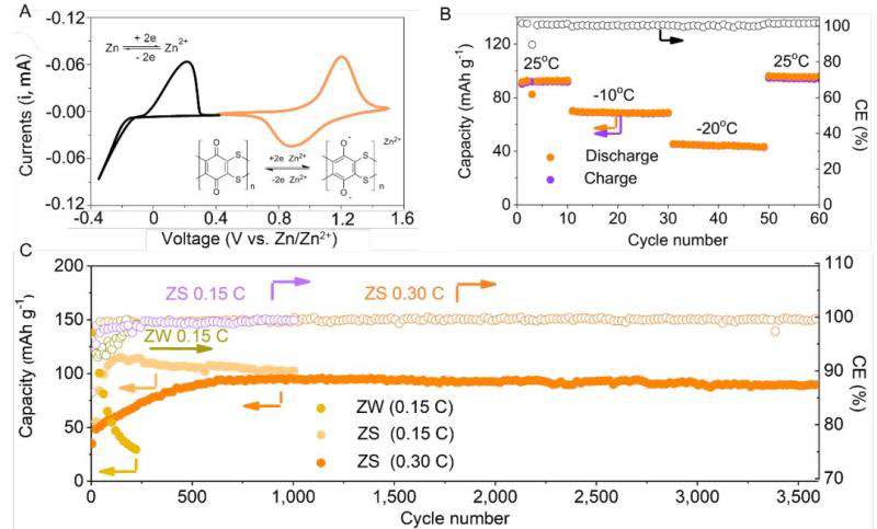 作者選擇了一種含有硫的醌類聚合物(聚(2, 3-二硫基-1, 4-對苯醌)(PDB))作為水系鋅離子電池的正極。該材料在鋰電池中被報道具有較高的比容量和循環(huán)穩(wěn)定性。通過循環(huán)伏安法對PDB/ZS/Zn電池進行測試(圖5A)發(fā)現(xiàn)PDB在ZS中可以實現(xiàn)可逆的充放電,在0.9 V和1.2 V左右分別出現(xiàn)了還原峰和氧化峰。進而采用恒流充放電測試鋅-有機電池的循環(huán)性能。如圖5C所示,由于正極材料發(fā)生了溶解及負極的不穩(wěn)定性,PDB/ZW/Zn電池容量很快發(fā)生了衰減。相反, PDB/ZS/Zn電池中正極材料的溶解被顯著抑制,且展現(xiàn)出了優(yōu)異的循環(huán)性能。其在0.15C的測試條件下,電池循環(huán)1000圈,容量保持率為91%;在0.3C條件下,電池循環(huán)3600圈,容量保持率為85.4%。同時,得益于ZS的寬液態(tài)溫度區(qū)間,PDB/ZS/Zn電池在溫度相繼降溫為?10 oC和?20 oC時,電池仍表現(xiàn)出優(yōu)異的循環(huán)穩(wěn)定性并可輸出70 mAh g?1和40 mAh g?1左右的容量,有望進一步在低溫環(huán)境中的應用。