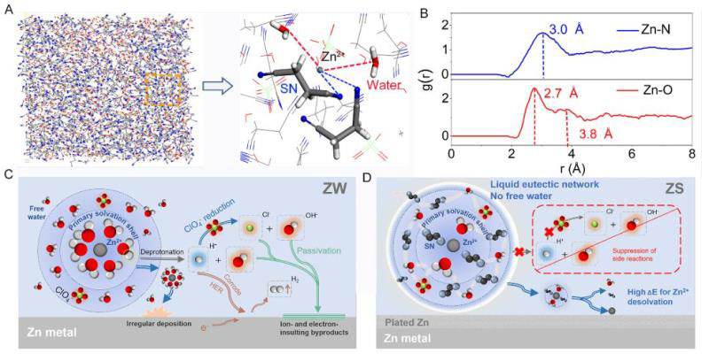 ▲圖4. ZS理論計算以及ZS和ZW電解質的結構示意圖(A)ZS電解質的MD理論計算優(yōu)化結構及(B)ZS電解質中的Zn2+-N和Zn2+-O的RDFs,(C)ZW和(D)ZS電解質的溶劑化結構以及界面反應機理示意圖。