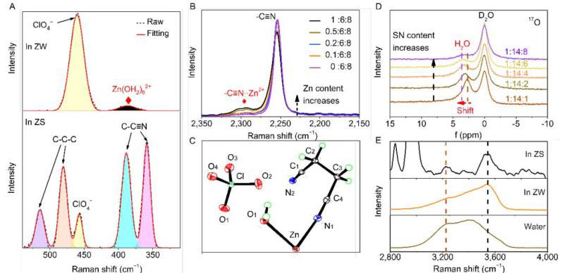 ▲圖3. ZS和ZW電解質的結構表征(A)ZW和ZS電解質的拉曼譜。(B)在2350?2150 cm ?1范圍內,不同比例的Zn(ClO4)2/H2O/SN混合物的拉曼譜。(C)在ZS電解質中獲得的單晶結構。(D)不同摩爾比Zn(ClO4)2/H2O/SN混合物中水分子中17O的化學位移。(E)水、ZS和ZW的拉曼譜。