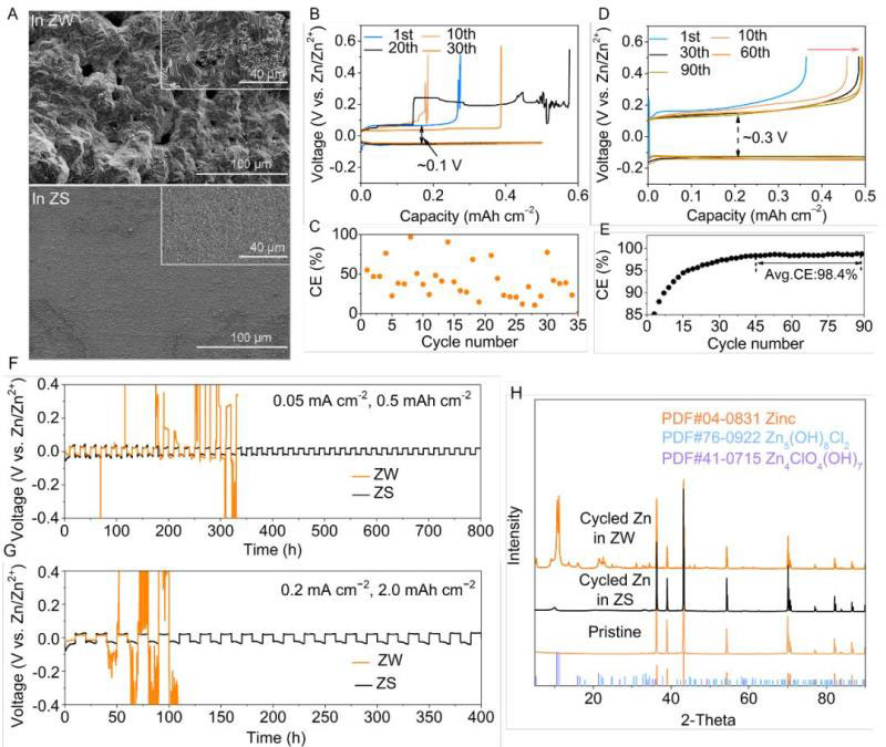 ▲圖2. ZW和ZS電解質的金屬鋅的沉積溶解行為。(A)在-0.3 V的條件下,在不銹鋼(SS)上沉積0.5 h后金屬鋅的SEM圖。恒電流條件下(B,C)ZW和(D,E)ZS的庫倫效率(電流密度為0.5 mA cm?2;面容量為0.5 mAh cm?2)。對稱電池分別在(F)0.05 mA cm?2 及(G)0.2 mA cm?2條件下的恒電流充放電曲線。(H)循環(huán)后鋅片的XRD表征。