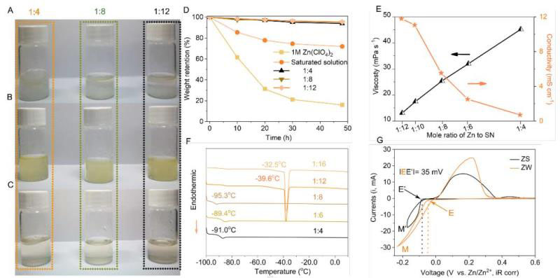 ▲圖1.電解液的制備以及表征。(A) Zn(SO4)2?7H2O,(B) Zn(NO3)2?6H2O 和 (C) Zn(ClO4)2?6H2O分別在SN中的溶解狀態(tài) (從左到右鋅鹽和SN的摩爾比分別為1:4,1:8和1:12),(D)不同電解質的質量在空氣中的變化 (25 oC)。(E) 不同摩爾比的Zn(ClO4)2?6H2O/SN的電導率以及粘度。(F) 不同摩爾比的Zn(ClO4)2?6H2O/SN的差示掃描量熱曲線。(G) 歐姆矯正后的ZS以及ZW電解質的CV曲線,掃速為1 mV s?1。