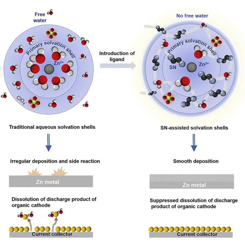 近年來提出的超高濃度solvent-in-salt電解質(SISEs)為穩(wěn)定鋅-有機電池提供了機會。有別于傳統(tǒng)電解液,SISEs中極低的自由溶劑含量可以有效抑制電池材料溶解。同時,由于極高的鹽濃度,陰離子直接參與金屬離子配位,誘導溶劑化層重排,調控金屬電沉積過程。但是,維持SISEs結構所需的大部分鹽并不參與電池反應且價格極高,有悖于鋅電池低成本的特色。此外,相比于單價離子,二價鋅離子難以解離,目前只有ZnCl2可以進入SISE范疇。但是,高濃ZnCl2溶液的腐蝕性極強且電位窗口窄。因此,亟需發(fā)展水系鋅電解質設計的新角度和新方法。