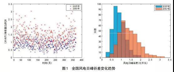 隨著間歇性可再生能源的裝機(jī)規(guī)模不斷擴(kuò)大,風(fēng)電和光伏出力波動(dòng)范圍日益變大。以日峰谷差為例,風(fēng)電出力日峰谷差冬季和春季較大,夏季和秋季相對(duì)較小。2035年全國風(fēng)電功率日峰谷差最大值約為1.9億千瓦,中位數(shù)約為0.9億千瓦;2050年全國風(fēng)電日峰谷差最大值約為3.0億千瓦,中位數(shù)約為1.3億千瓦。光伏出力日峰谷差春季和秋季出力最大,夏季次之,冬季出力最小。2035年全國光伏功率日峰谷差約為4.0億千瓦,中位數(shù)約為3.0億千瓦;2050年全國光伏日峰谷差最大值約為7.3億千瓦,中位數(shù)約為5.5億千瓦(見圖1、圖2)。