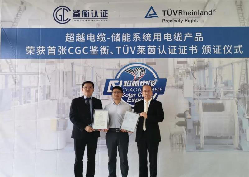 7月7日,CGC北京鑒衡認證中心聯(lián)合TüV萊茵共同為常州超越特種電纜有限公司(簡稱:超越電纜)頒發(fā)了儲能系統(tǒng)用電纜認證證書。