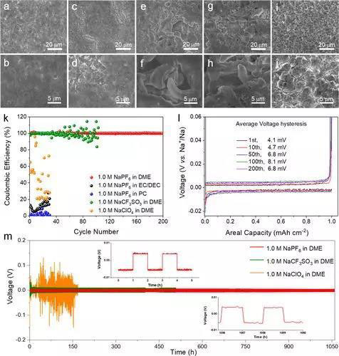 圖2. 電解質(zhì)在鈉陽(yáng)極電鍍/剝離中的作用。在含有(a,b)NaPF6,(c,d)NaCF3O3,(e,f)NaClO4的1.0 M電解液中,以及含有NaPF6/EC/DEC或(i,j)PC溶劑的1.0 M電解液中鍍鈉的掃描電鏡。(k) 庫(kù)侖效率。(l) Na | Cu電池的電壓分布和平均電壓滯后。(m) Na | Na對(duì)稱電池的電壓-時(shí)間曲線。