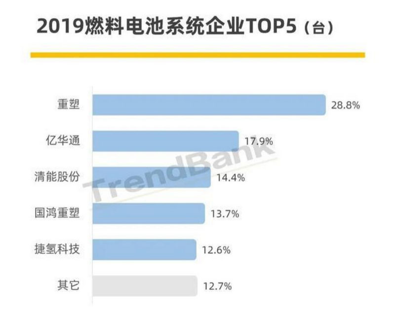 如今,在國家新政發(fā)布后,各地方政府積極響應,并出臺一系列規(guī)劃和鼓勵政策,燃料電池汽車行業(yè)蒸蒸日上,系統(tǒng)配套企業(yè)也成為了這次補貼新政的鼓勵和支持對象,從2019年度系統(tǒng)企業(yè)市占率可以看出,前五企業(yè)基本占據(jù)市場80%份額,市場集中度非常高,一定意義上來說不利于市場的發(fā)展。