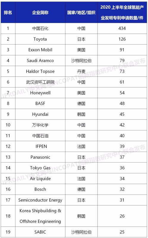 在近日公布的《2020上半年全球氫能產(chǎn)業(yè)發(fā)明專利排行榜》中,中國共有45家企業(yè)上榜,其中,中國石化以434件專利位居榜首。