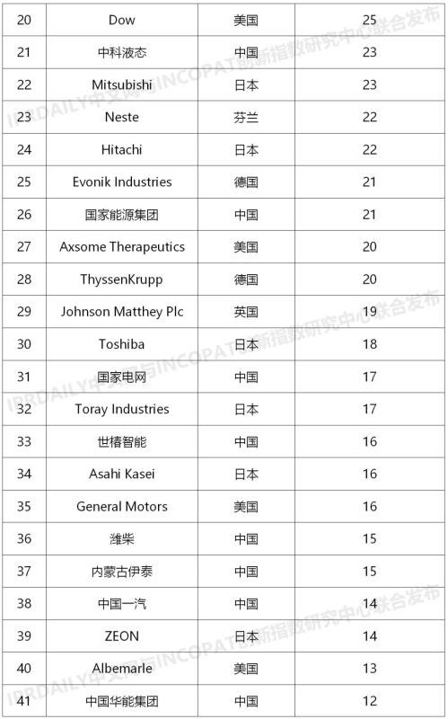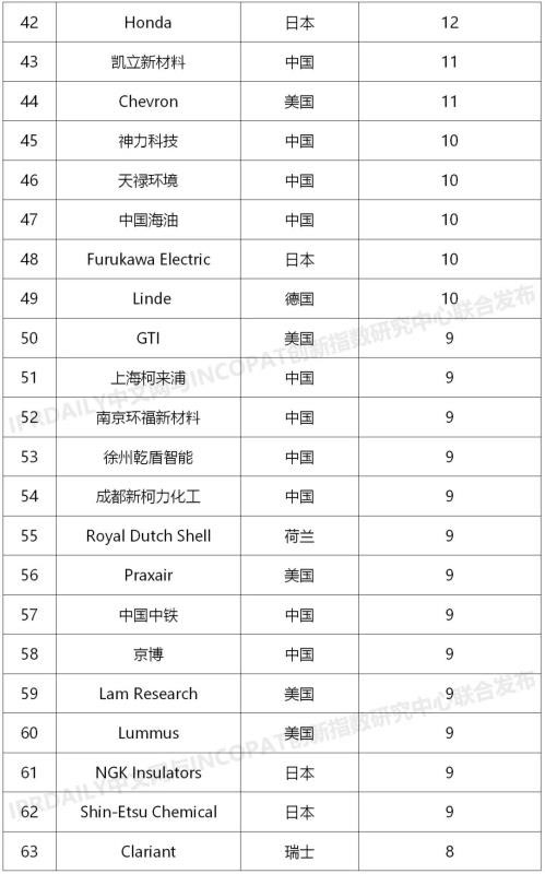 中國上榜企業(yè)共45家,其中3家企業(yè)進(jìn)入榜單前十。中國石化以434件專利位列第一,遠(yuǎn)高于其他企業(yè)。武漢資環(huán)工研院和萬華化學(xué)分別以61件、42件專利數(shù),位列第三和第十。