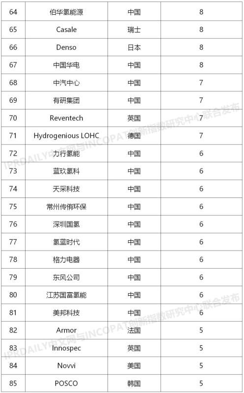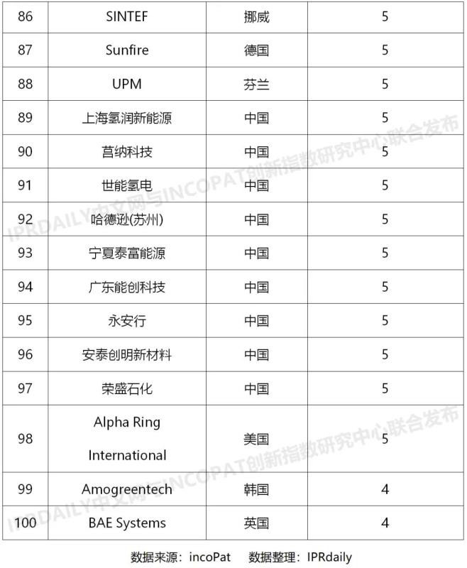 據(jù)悉,該排行榜由知識(shí)產(chǎn)權(quán)產(chǎn)業(yè)媒體IPRdaily與inco Pat創(chuàng)新指數(shù)研究中心聯(lián)合發(fā)布,對(duì)2020年1月1日至6月26日,全球公開的氫能產(chǎn)業(yè)發(fā)明專利申請(qǐng)數(shù)量進(jìn)行統(tǒng)計(jì)排名,入榜前100名企業(yè)主要來自13個(gè)國家、組織或地區(qū)。