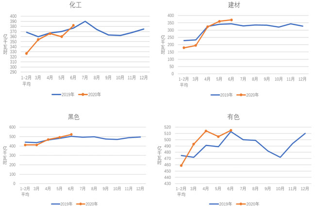 6月份,化工行業(yè)用電量382億千瓦時,同比增長1.8%,增速比上年同期提高1.0個百分點;建材行業(yè)用電量370億千瓦時,同比增長8.0%,增速比上年同期提高1.1個百分點;黑色金屬冶煉行業(yè)用電量523億千瓦時,同比增長4.0%,增速比上年同期回落8.5個百分點;有色金屬冶煉行業(yè)515億千瓦時,同比增長2.6%,增速比上年同期提高1.4個百分點。