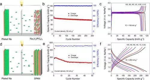 圖5. 快速充電鈉離子和鈉硫電池。(a)Na離子全電池和(d)Na-S全電池的配置示意圖,包括鍍Na作為陽(yáng)極。鈉離子電池(b、c)和鈉硫(e、f)電池的比較循環(huán)試驗(yàn)性能和額定容量。