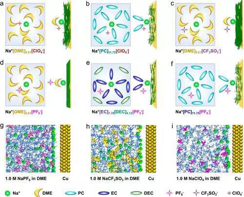 溶劑化殼層中溶劑的排列會(huì)影響陰離子的位置,因?yàn)椴煌腘a+溶劑相互作用的結(jié)合能和B值不同。例如,在1.0 M NaPF6/DME的情況下,我們發(fā)現(xiàn)PF6-與Na+具有中等結(jié)合能和較低的B值,因此,當(dāng)在電解液中使用EC/DEC溶劑時(shí),Na陽(yáng)極的性能稍差。PC溶劑的表現(xiàn)也與EC/DEC相似。這是因?yàn)镋C/DEC或PC與Na+的相互作用較弱,因此PF6-陰離子可以很容易地取代EC/DEC或PC,使其更接近Na金屬表面,從而引發(fā)表面反應(yīng)和腐蝕。相比之下,DME與Na+具有較強(qiáng)的鍵合(即形成五環(huán)絡(luò)合物)。因此,DME使PF6-陰離子遠(yuǎn)離Na電極表面,從而有效地抑制腐蝕。而DME不能輕易阻止ClO4-和CF3SO3-與Na+結(jié)合。這是因?yàn)镃lO4-具有高度自由度(即低位阻),而CF3SO3-與Na+有很強(qiáng)的相互作用,這使得這些陰離子很容易遷移。