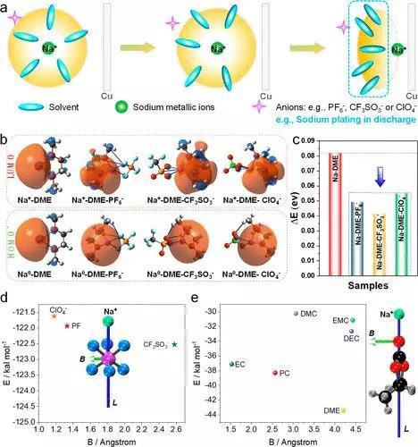 模型預(yù)測(cè)NaClO4基電解質(zhì)是金屬陽(yáng)極最差的(即,腐蝕性最強(qiáng))。這可歸因于Na+和ClO4-之間的結(jié)合能較低,體積小(B值較低,為1.18)。因此,ClO4-可以相當(dāng)自由地移動(dòng),并且更頻繁地到達(dá)電極表面。因此,在二甲醚、EC/DEC或PC溶劑中,ClO4-會(huì)嚴(yán)重腐蝕金屬電極。相比之下,CF3SO3-與Na+有很強(qiáng)的相互作用(結(jié)合能為?122.5 kcal/mol,圖3d),盡管B值(2.58?表示空間位阻)較高;因此,CF3SO3?可能不會(huì)自由地向電極移動(dòng),因此其腐蝕作用應(yīng)比ClO4?小。
