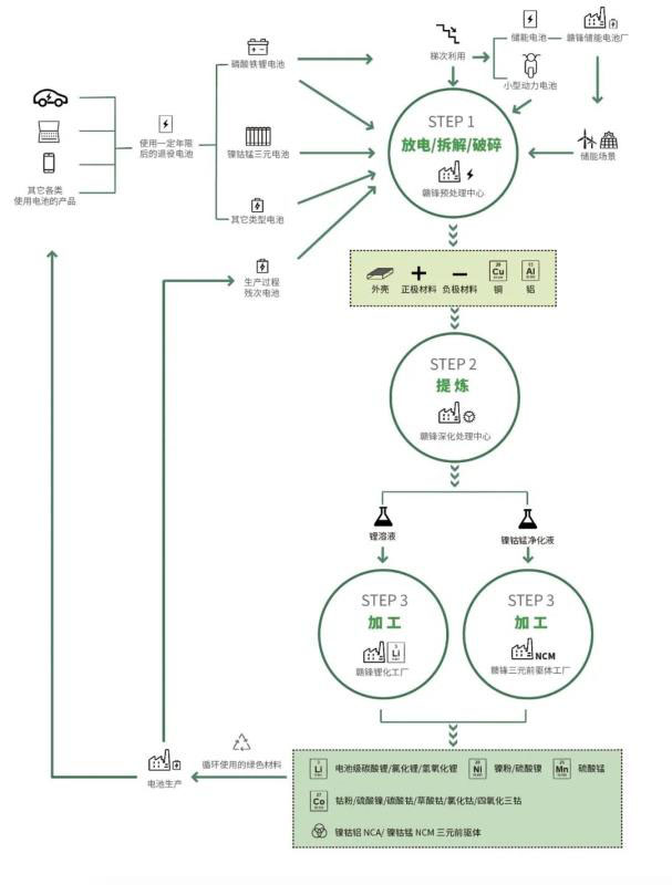 電池經(jīng)系統(tǒng)回收后,將產(chǎn)出銅鋁等金屬,電池級碳酸鋰、氫氧化鋰、氯化鋰等化合物,以及鎳鈷鋁、鎳鈷錳等不同型號的三元前驅(qū)體。循環(huán)產(chǎn)物擁有良好品質(zhì),悉數(shù)可以再次應(yīng)用于動力電池、儲能電池、消費設(shè)備電池以及化工材料的制作,真正實現(xiàn)資源的循環(huán)使用。