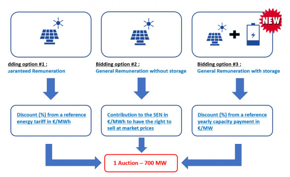 葡萄牙舉行的裝機(jī)容量為700MW太陽(yáng)能發(fā)電容量拍賣(mài)活動(dòng)的三種不同選項(xiàng)