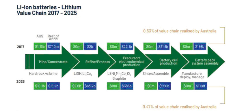 根據(jù)評估結(jié)果,盡管澳大利亞已經(jīng)占據(jù)了電池生產(chǎn)原料供應(yīng)市場的很大一部分,但澳大利亞卻錯失了包括材料提煉在內(nèi)的下游加工以及電池生產(chǎn)和組裝等更大的市場機(jī)會。