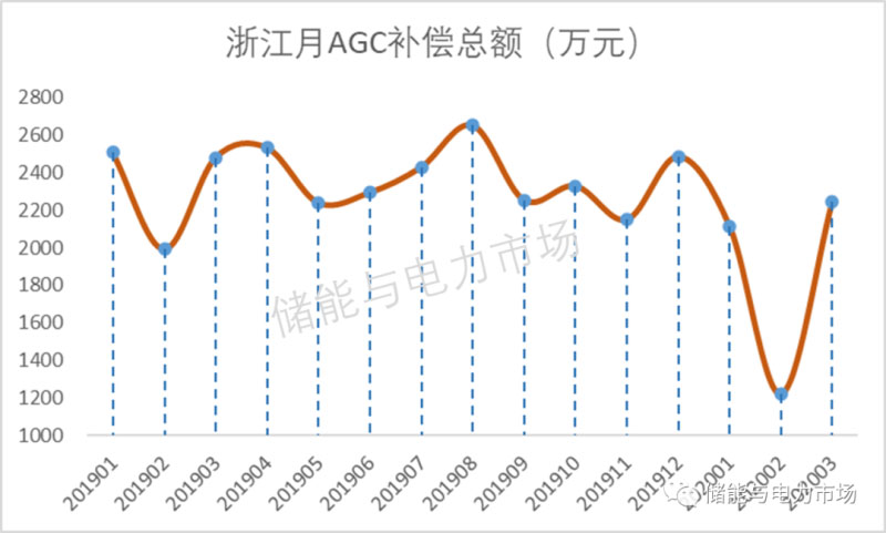 2019年1月-2020年3月間,浙江省的AGC調(diào)頻輔助服務(wù)補(bǔ)償額平均為2262萬元,除個(gè)別月份出現(xiàn)比較低的值外,基本穩(wěn)定在2000萬以上,最高為2019年8月,2651萬元。