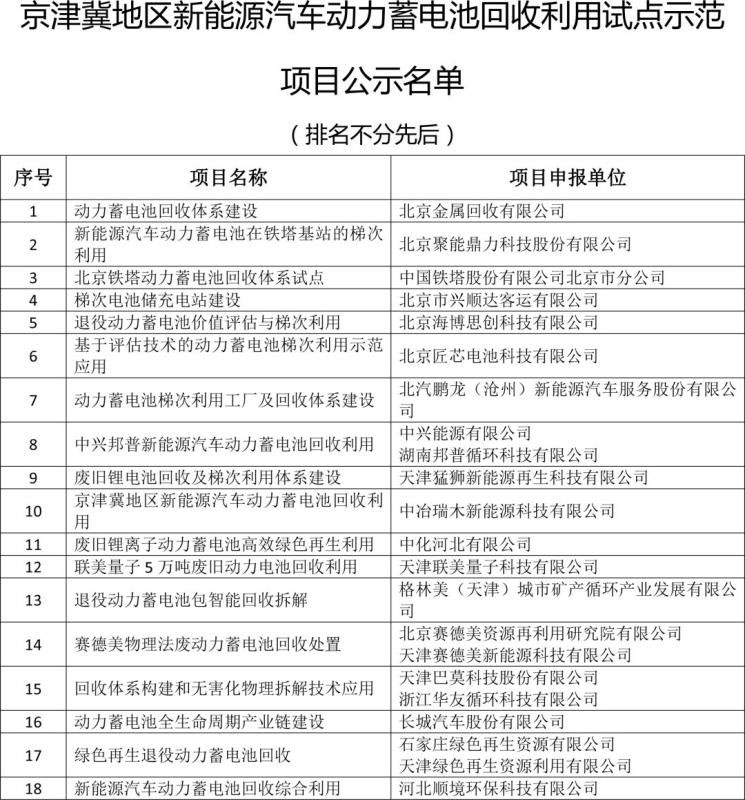 2019年6月14日,北京市經(jīng)濟(jì)和信息化局發(fā)布了《關(guān)于京津冀地區(qū)新能源汽車動(dòng)力電池回收利用試點(diǎn)示范項(xiàng)目》的公示,共包含21家申報(bào)單位申報(bào)的18個(gè)試點(diǎn)示范項(xiàng)目,其中包含中國鐵塔北京分公司的“北京鐵塔動(dòng)力蓄電池回收體系試點(diǎn)”、北京市興順達(dá)客運(yùn)有限公司的“梯次電池儲(chǔ)充電站建設(shè)”、北京匠芯電池科技有限公司的“基于評(píng)估技術(shù)的動(dòng)力蓄電池梯次利用示范應(yīng)用”等。