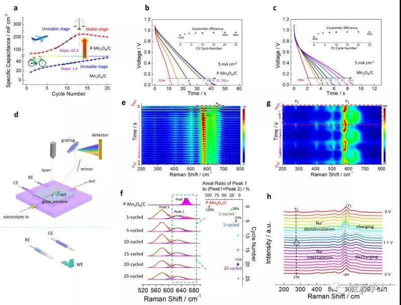 圖3 (a) P-Mn3O4/C和(b) Mn3O4/C不同循環(huán)后的比電容對比;(b) P-Mn3O4/C和(c) Mn3O4/C不同循環(huán)后的恒流放電曲線對比;(d) 原位拉曼測試示意圖;(e) P-Mn3O4/C電化學(xué)演化過程的原位拉曼mapping圖和(f) 相應(yīng)的不同循環(huán)后的拉曼圖譜;(g) 相演化后的P-Mn3O4/C在電荷存儲過程中的原位拉曼mapping圖和(h) 相應(yīng)的不同電壓下的拉曼圖譜。