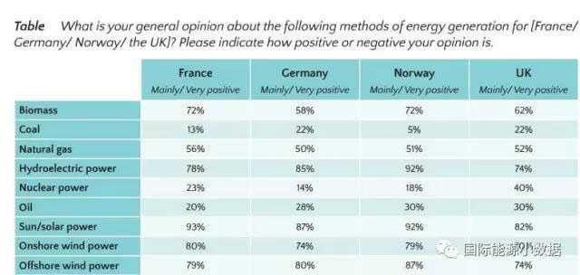 在德國,最受青睞的能源也是太陽能發(fā)電(87%),其次是水電(85%)、海上風(fēng)電(80%)、陸上風(fēng)電(74%)、生物質(zhì)(58%)、天然氣(50%)。比較負(fù)面的能源是核電(14%)、煤炭(22%)、石油(28%)。