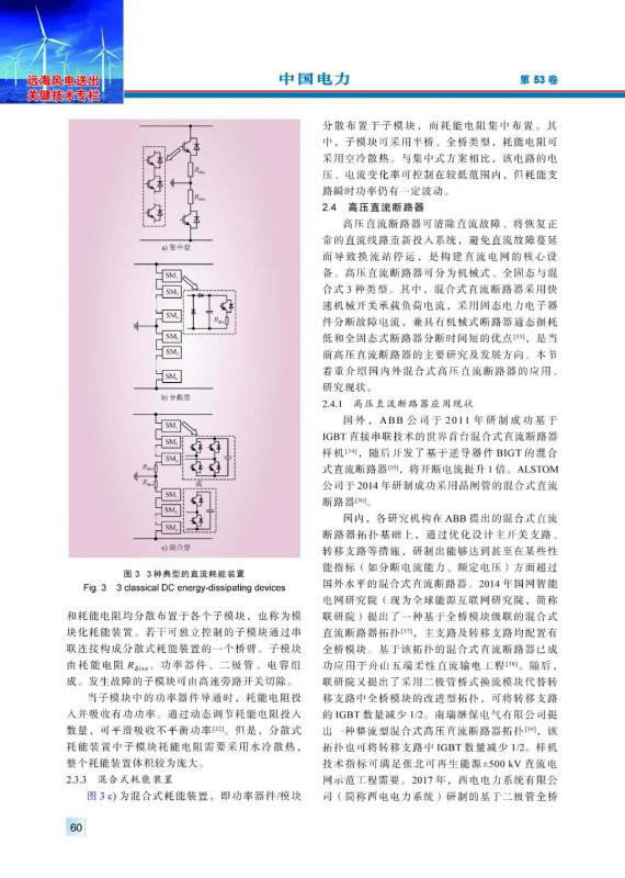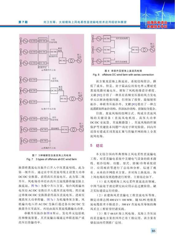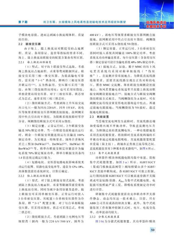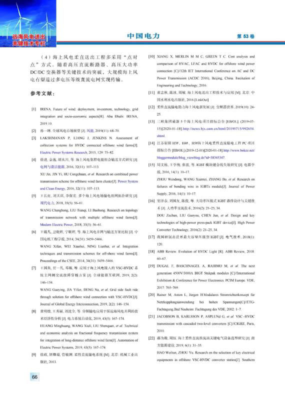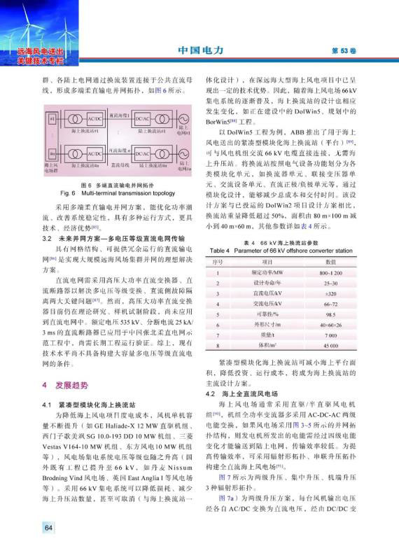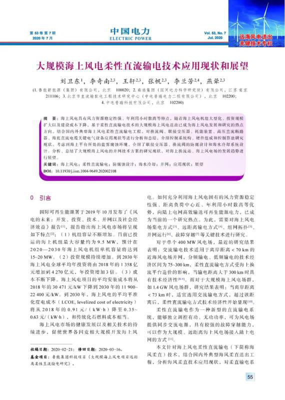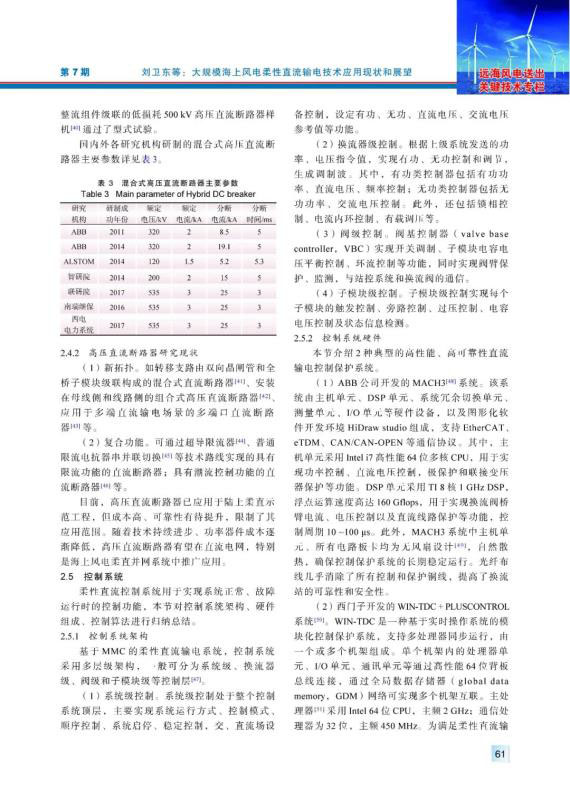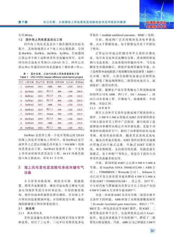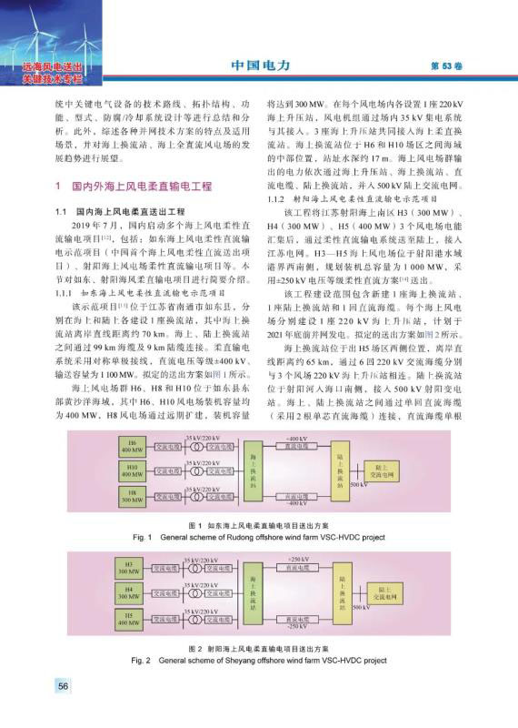海上風(fēng)電具有風(fēng)力資源穩(wěn)定性強(qiáng)、年利用小時(shí)數(shù)高等特點(diǎn),隨著海上風(fēng)電機(jī)組大型化、投資規(guī)模擴(kuò)大以及建設(shè)成本下降,基于柔性直流輸電技術(shù)的大規(guī)模海上風(fēng)電送出已成為海上風(fēng)電發(fā)展和研究的熱點(diǎn)方向。結(jié)合國內(nèi)外典型海上風(fēng)電柔性直流輸電工程,對(duì)換流閥、聯(lián)接變壓器、耗能裝置、高壓直流斷路器、海底直流電纜關(guān)鍵電氣設(shè)備應(yīng)用現(xiàn)狀等進(jìn)行分析和總結(jié),介紹控制系統(tǒng)構(gòu)、硬件組成和控制算法研究現(xiàn)狀??紤]到海上平臺(tái)所處的鹽霧腐蝕環(huán)境,介紹了聯(lián)接變壓器、換流閥的防腐設(shè)計(jì)和海水冷卻系統(tǒng)設(shè)計(jì)。分析、總結(jié)了大規(guī)模海上風(fēng)電的并網(wǎng)技術(shù)方案的研究現(xiàn)狀,對(duì)海上換流站、海上風(fēng)電場(chǎng)的發(fā)展趨勢(shì)進(jìn)行展望。